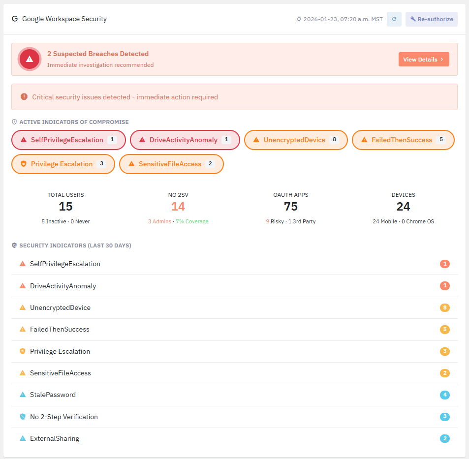 Within a couple minutes, Lavawall® automatically puts together the data that Google has available to identify suspected breaches and security risks.It also identifies easy wins to secure your environment, like unencrypted devices, users without two-step verification, inactive users, and apps that might be used to steal your sensitive information.